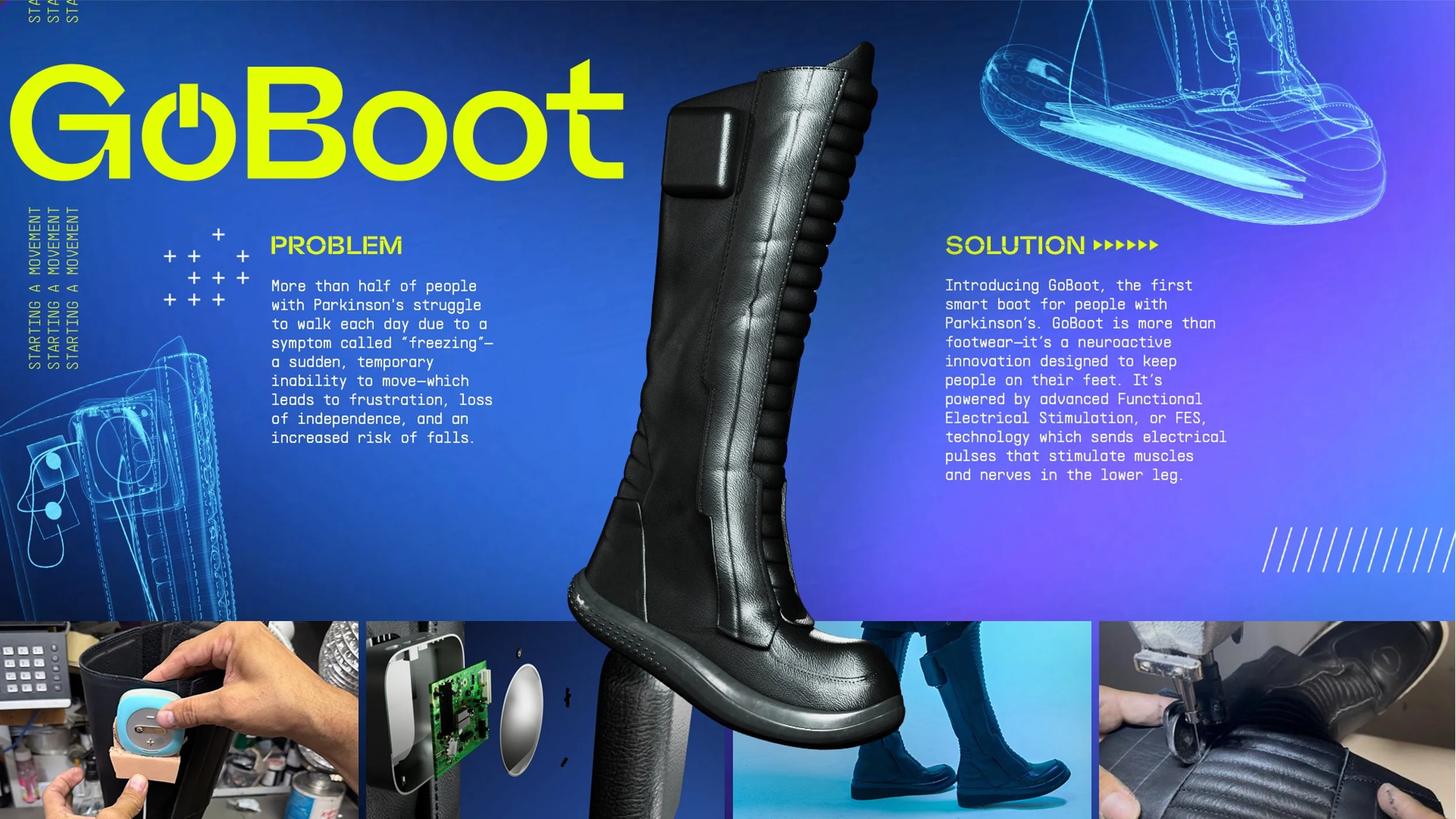 More than half of people with Parkinson's struggle to walk each day due to a symptom called “freezing”—a sudden, temporary inability to move—which leads to frustration, loss of independence, and an increased risk of falls. We changed that with Go-Boot, converging the latest in shoe design, with Functional Electrical Stimulation to provide paced pulsing aiding in stability and consistency of a person’s gate.