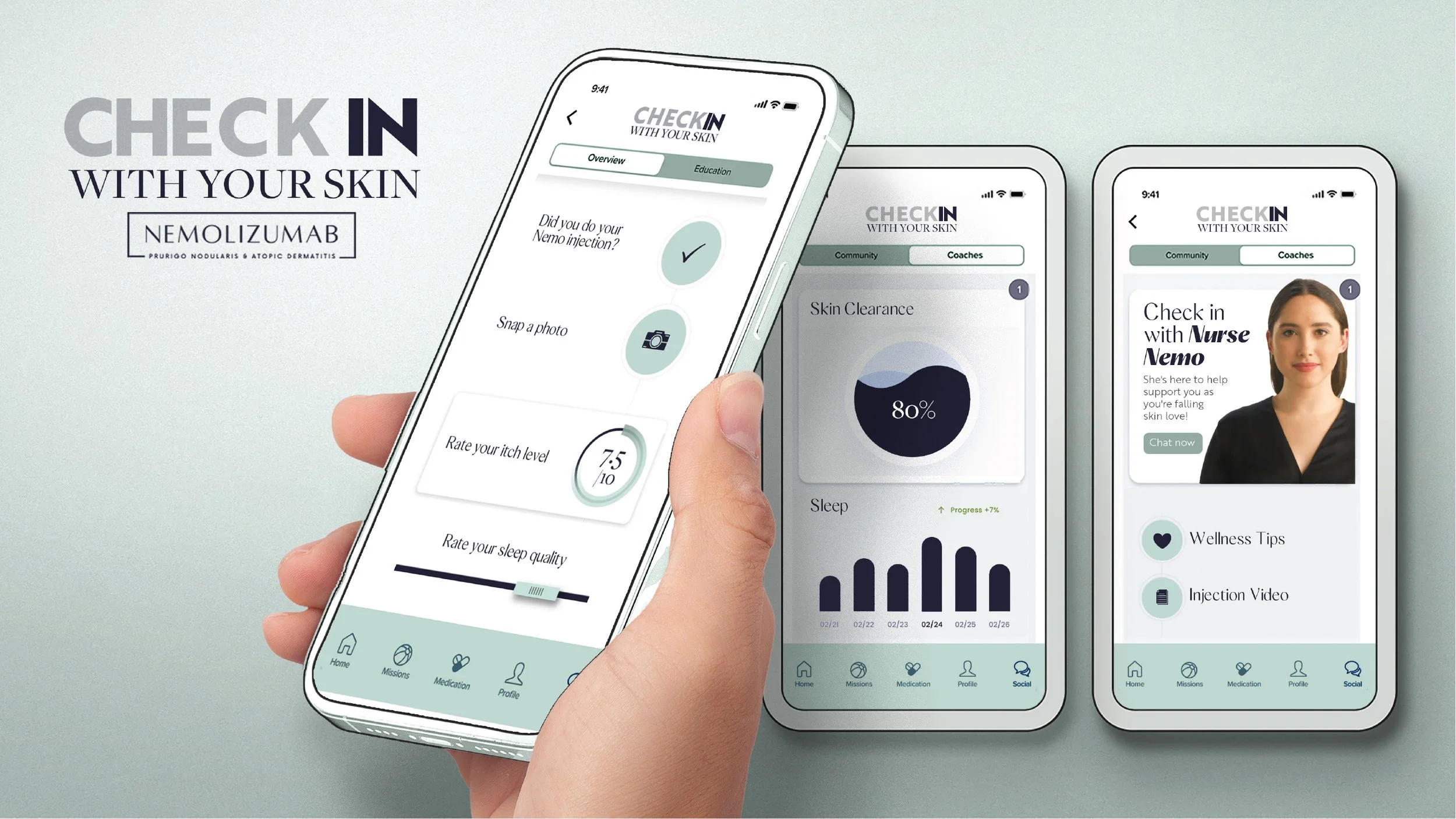 A mobile companion designed to help patients stay connected to their treatment journey beyond the doctor’s office. The app invites people to track itch severity, sleep quality, and skin progress over time. It transforms daily check-ins into moments of reassurance, empowerment, and control—reinforcing SkinLove as an ongoing relationship, not a single intervention.