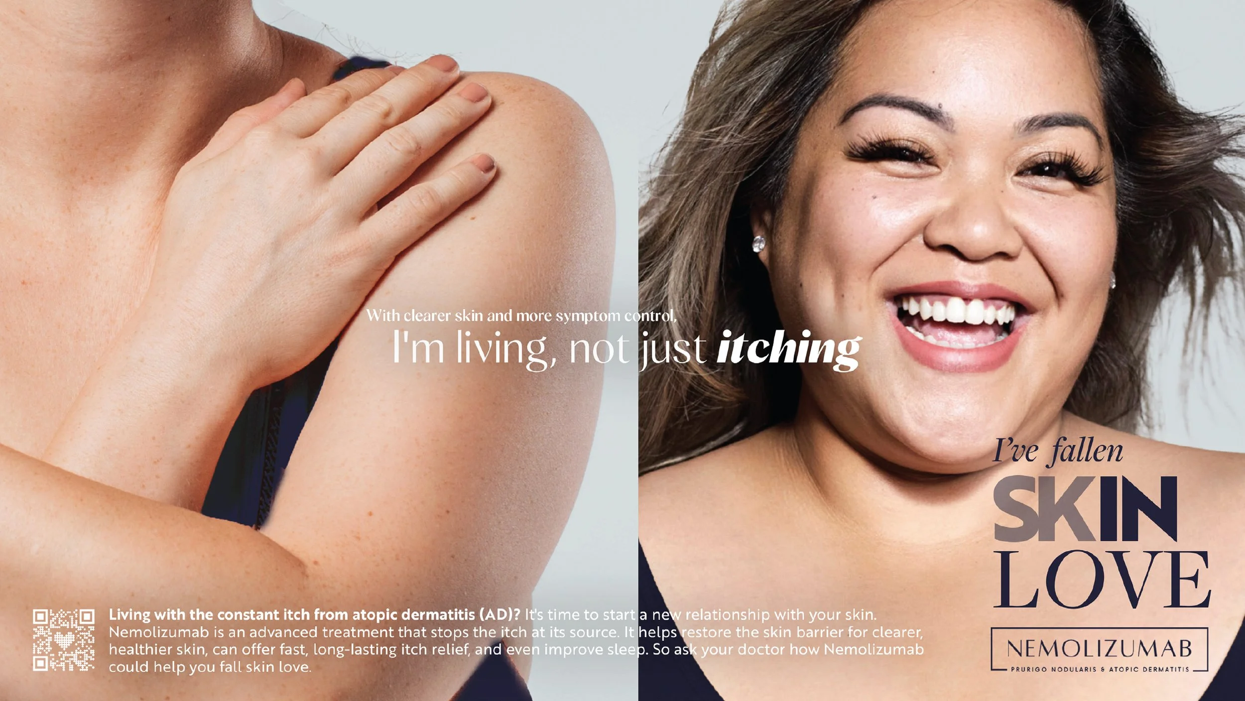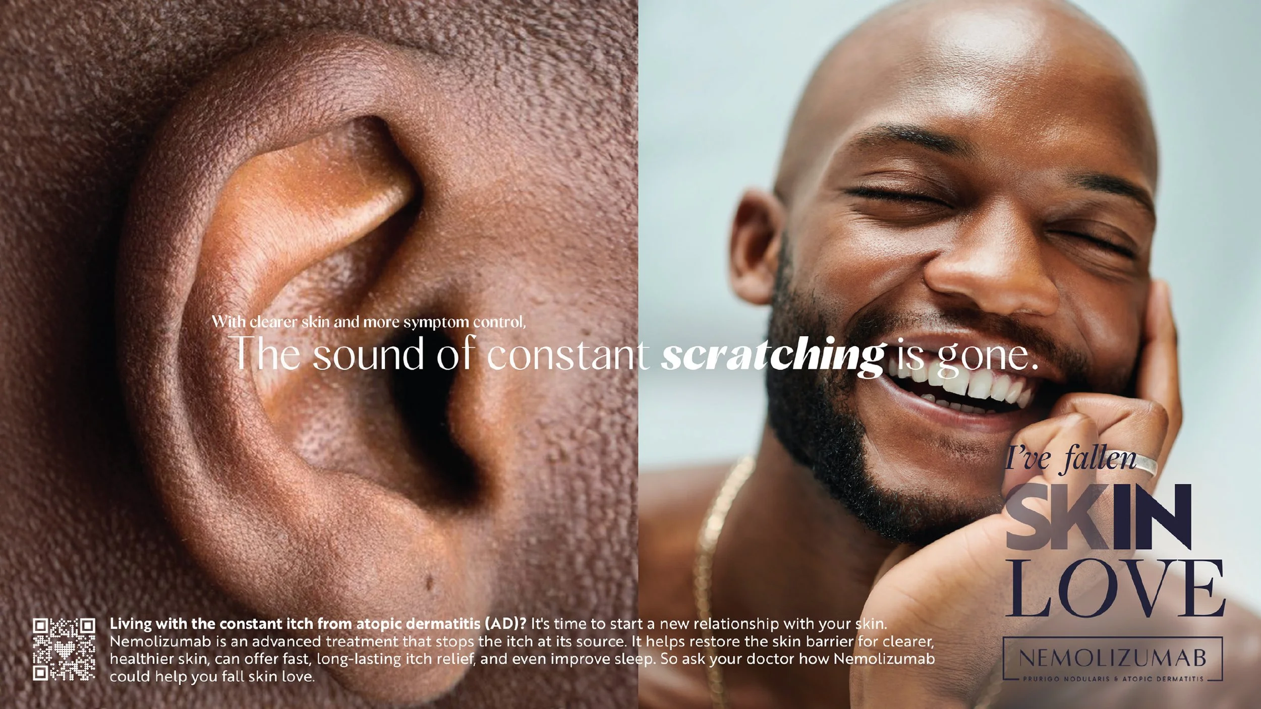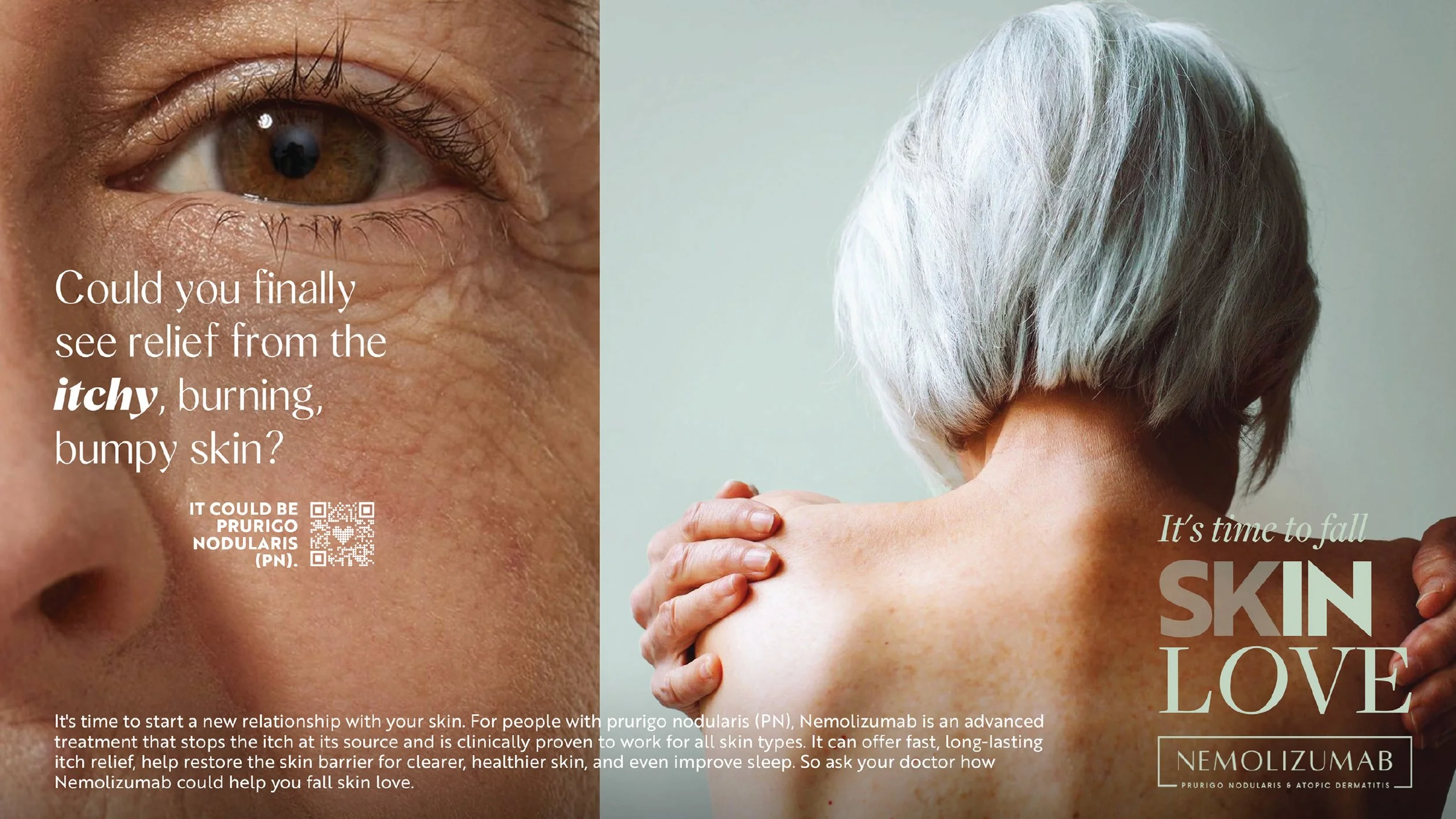 These ads pair intimate, close-crop portraits of real people with prurigo nodularis and atopic dermatitis, capturing both the physical toll of relentless itch and the emotional relief that comes with control. The campaign ultimately positions Nemolizumab as more than symptom relief—it’s an invitation to fall back in love with your skin and your life.