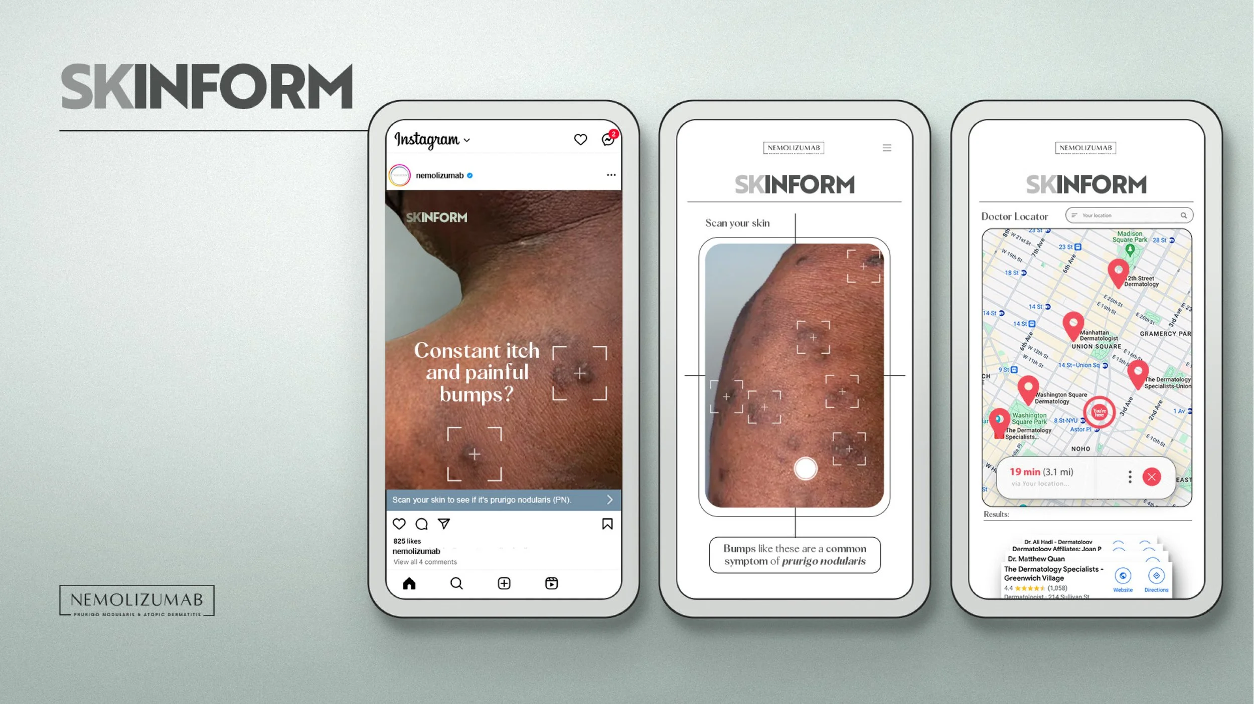 An awareness-to-diagnosis gateway that helps people recognize the signs of prurigo nodularis and atopic dermatitis. Using familiar social and mobile behaviors, Skinform encourages users to “scan” their skin, learn what symptoms may mean, and take the next step toward medical guidance. It lowers barriers to action by replacing uncertainty with clarity and confidence.
