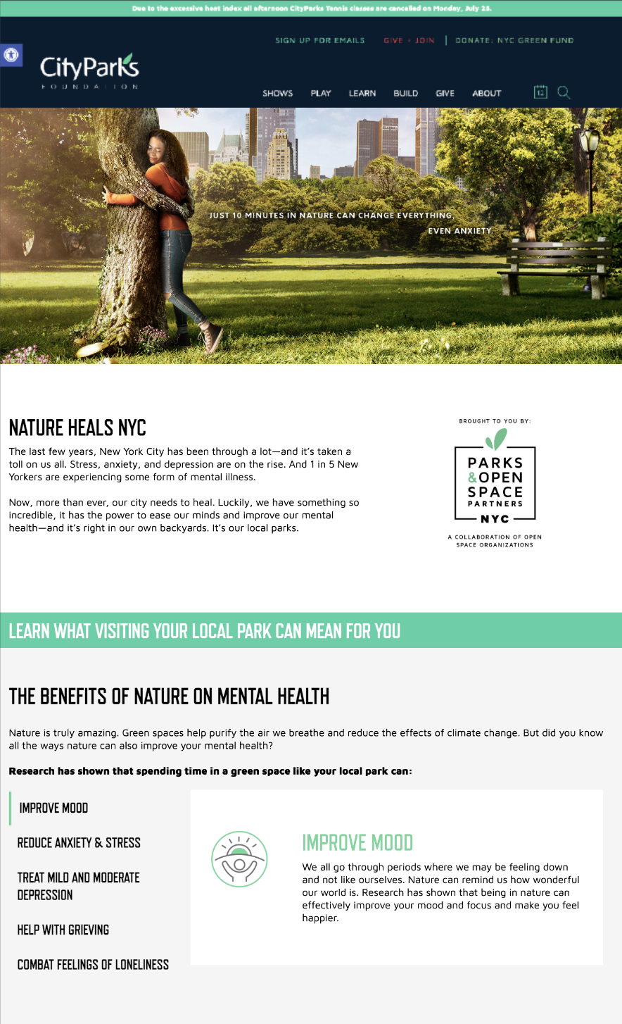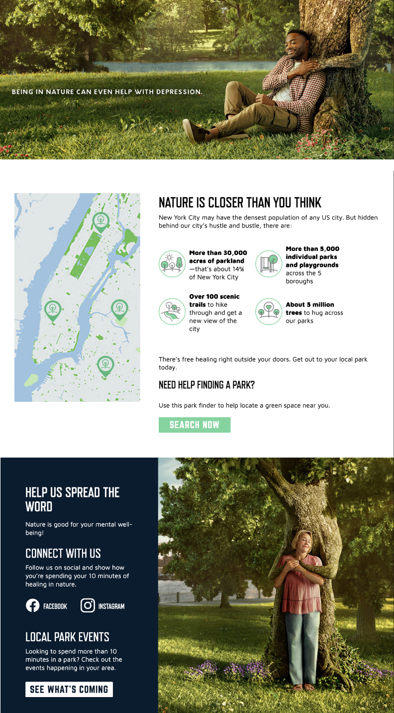 The content focused on the benefits of nature for those struggling with anxiety, depression, and loneliness. Users could search for parks, playgrounds, and trails right in the “backyard” of New York City, making the benefit feel immediate, accessible, and inclusive for everyone.